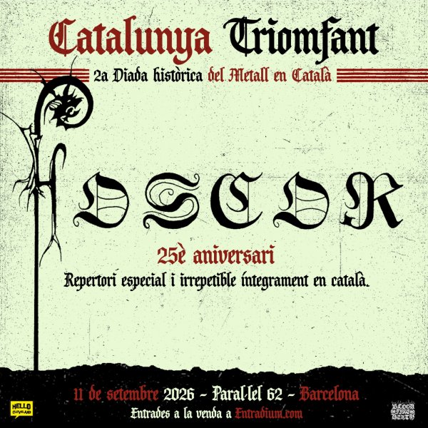 Tras el éxito rotundo que significó la primera edición del Catalunya Triomfant, el 11 de septiembre de 2026 acontecerá la Segunda Diada histórica del Metal en Català en la sala Paral·lel 62 de Barcelona. Se trata del mismo enclave en el que, hace apenas dos meses, Vidres a la Sang, Ósserp, Udol, Bocc, Siroll! y Assot hicieron historia al congregar 1.200 personas en un concierto de metal extremo underground, y cantado únicamente en su lengua materna.